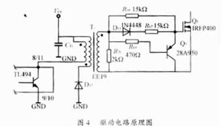 驅(qū)動(dòng)電路如圖4所示。TL494輸出50kHz的脈沖信號(hào),通過(guò)高頻脈沖變壓器耦合去驅(qū)動(dòng)功率MOS管。次級(jí)脈沖電壓為正時(shí),MOS管導(dǎo)通,在此期間Q7截止,由其構(gòu)成的泄放電路不工作。當(dāng)次級(jí)脈沖電壓為零時(shí),則Q7導(dǎo)通,快速泄放MOS管柵級(jí)電荷,加速M(fèi)OS管截止。R70是用于抑制驅(qū)動(dòng)脈沖的尖峰,R68、D15、R67可以加速驅(qū)動(dòng)并防止驅(qū)動(dòng)脈沖產(chǎn)生振蕩。D17和與它相連的脈沖變壓器繞組共同構(gòu)成去磁電路。