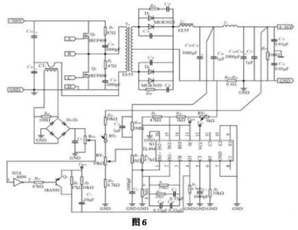 控制電路采用通用脈寬調(diào)制器TL494,具有通用性和成本低等優(yōu)點(diǎn),見(jiàn)圖6。輸出電壓經(jīng)R40、RV2、RV1、R41進(jìn)行分壓采樣,經(jīng)R5阻抗匹配后送到TL494腳1。RV1裝在電源前面板上用于實(shí)現(xiàn)輸出電壓的調(diào)節(jié)。R103和C14將輸出電感L1前信號(hào)采樣,經(jīng)R5送到TL494腳1,用于提高電源穩(wěn)定度,消除L1對(duì)環(huán)路穩(wěn)定性影響。
