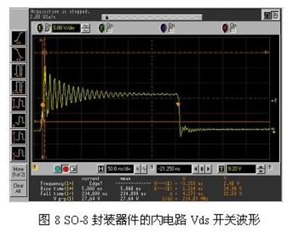 圖8示出的是SO-8器件對(duì)30A電流進(jìn)行開(kāi)關(guān)操作時(shí)的波形,