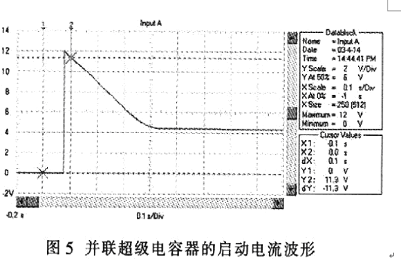 超級電容器">電容器與蓄電池并聯(lián)時(shí),汽車啟動(dòng)過程的電壓波形如圖4所示,電流波形如圖5所示。與圖1和圖2相比,啟動(dòng)瞬間電壓跌落由只采用蓄電池時(shí)的3.2V提升到7.2V;啟動(dòng)電流從560 A提高到l200 A;啟動(dòng)瞬時(shí)的電源輸出功率從2 kW上升到8.7kW;啟動(dòng)過程的平穩(wěn)電壓由7 V提高到9 .4 V;啟動(dòng)過程的平穩(wěn)電流由280 A提高到440 A;啟動(dòng)過程的電源平穩(wěn)輸出功率從2.44 kW提高到4.12 kW。