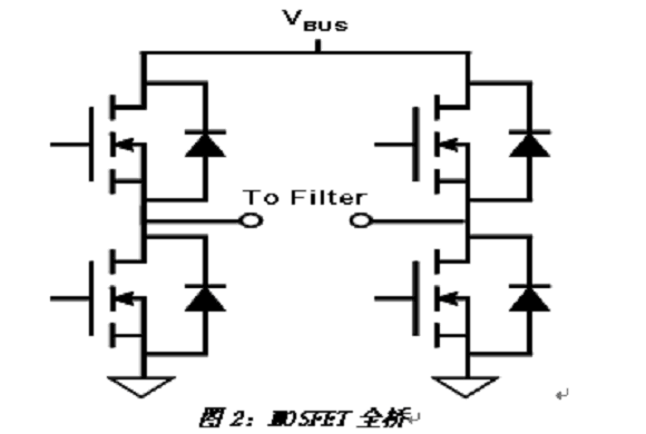 濾波之后,輸出橋產(chǎn)生一個(gè)50Hz的正弦電壓及電流信號(hào)。一種常見的實(shí)現(xiàn)方案是采用標(biāo)準(zhǔn)全橋結(jié)構(gòu) (圖2)。圖中若左上方和右下方的開關(guān)導(dǎo)通,則在左右終端之間加載一個(gè)正電壓;右上方和左下方的開關(guān)導(dǎo)通,則在左右終端之間加載一個(gè)負(fù)電壓。
