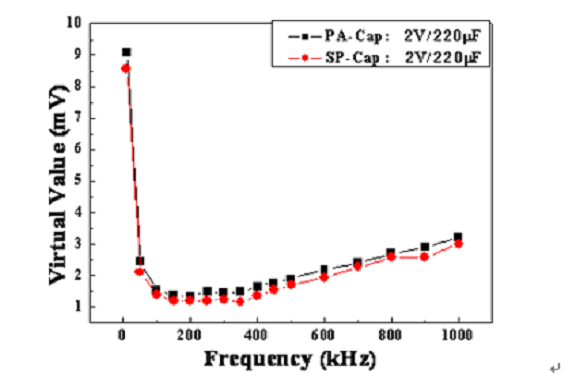 如上面的濾波效果顯示,當(dāng)開關(guān)電源頻率在300KHz左右時(shí),同種規(guī)格的PA-Cap的輸出均方根與SP-Cap的很接近,所以PA-Cap濾波效果基本接近于SP-Cap。由于具有低的ESR、允許的紋波電流大,所以PA-Cap也是DC/DC轉(zhuǎn)換器或開關(guān)電源輸出電容的優(yōu)選電容之一。