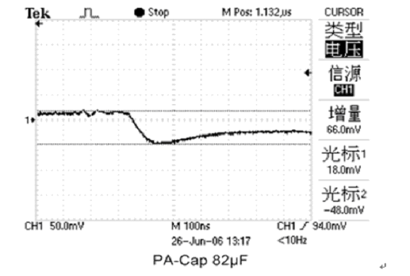 當(dāng)MPU的負(fù)載電流急劇增大時(shí),由于PA-Cap的ESR比普通鉭電容小很多,所以接上PA-Cap的電源電壓下降只有66mV比普通鉭電容小好幾倍(如圖10、11所示),達(dá)到良好的去耦效果。PA-Cap不僅去耦效果好,而且不燃燒不爆炸,是MPU等數(shù)字電路作為高速保護(hù)備用電荷庫的優(yōu)選電容之一。