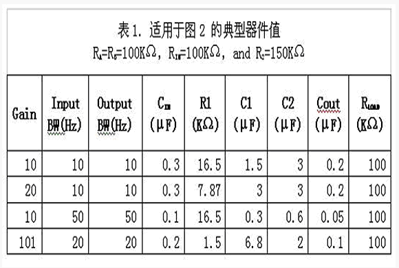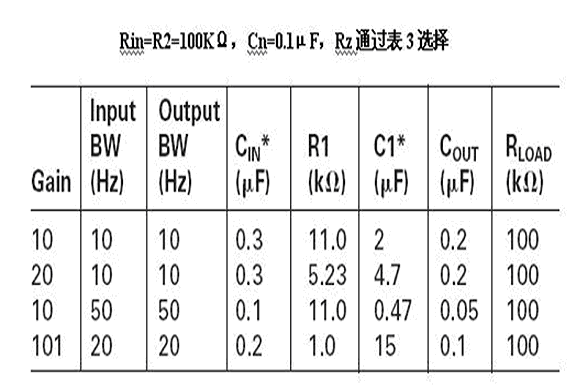 設(shè)計單電源運算放大器電路,需要考慮輸入偏置電流誤差、電源抑制、增益、以及輸入與輸出線路帶寬等等。然而普通的應用設(shè)計是可以通過查表來獲得,見表1。在單電源電壓為15V或12V時偏置分壓的兩個電阻通常選用100kΩ,這樣可以在電源消耗與輸入偏置電流誤差之間合理的折中。5V單電源偏置分壓電阻減小到一個比較低的值,例如42kΩ。還有些在3.3V應用中偏置分壓電阻選在27kΩ左右。