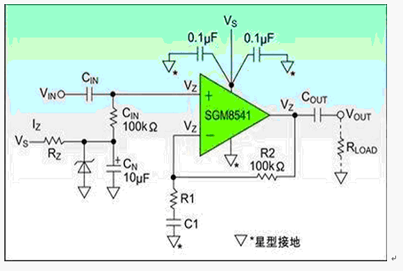 首先,電路的電源抑制幾乎沒有,電源電壓的任何變化都將直接通過兩個分壓電阻改變偏置電壓Vs/2,但電源抑制的能力是電路非常重要的特性。例如此電路的電源電壓1伏的變化,能引起偏置電路電壓的輸出Vs/2變化0.5伏。該電路的電源抑制僅僅只有6dB,通過選用SGM8541運算放大器可以增強電源抑制能力。