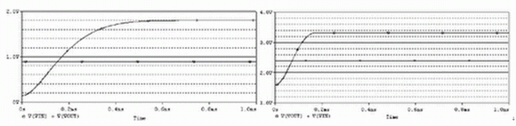 此DC/DC轉(zhuǎn)換器在低電壓0.9V下就可以正常工作;典型的輸入/輸出值為:VIN=2.4V,VOUT=3.3V,模擬結(jié)果如圖5、圖6所示。