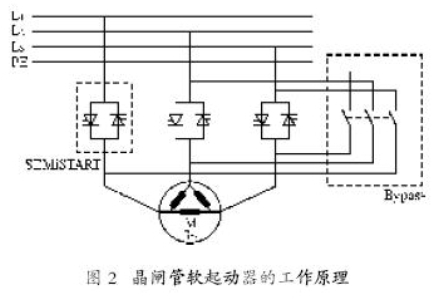 為了控制起動(dòng)階段施加在感應(yīng)電機(jī)上的電壓,需要一個(gè)軟起動(dòng)裝置(軟起動(dòng)器)。在軟起動(dòng)器中,半導(dǎo)體(晶閘管)被用于電壓的控制。其工作原理如圖2所示。