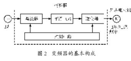 圖2所示為變頻器的基本構(gòu)成。它的基本原理是用一種特定的方式對變頻器中的晶閘管開關(guān)進(jìn)行導(dǎo)通和關(guān)斷,直接把輸入的電壓波形“大致”調(diào)制成所需頻率的交流波形。