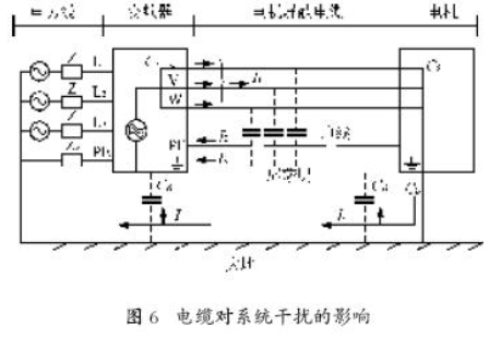 頻率范圍為150 kHz~30 MHz的電子干擾一般來自傳導(dǎo)。傳動(dòng)系統(tǒng)中范圍為30 MHz~1 GHz 的空間輻射干擾產(chǎn)生于逆變器,電機(jī)電纜及電動(dòng)機(jī)。由于電動(dòng)機(jī)電壓較高的dv/dt 以及電機(jī)電纜上的容性電流產(chǎn)生了漏電流,而且使用屏蔽的電機(jī)電纜也會(huì)增加漏電流,如圖6所示。
