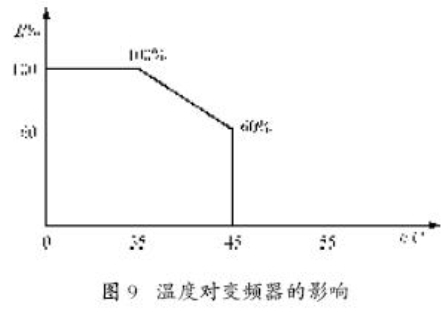 變頻器主要由各種電子元器件組成,它對于工作環(huán)境的要求較高,當(dāng)環(huán)境溫度超過它的最高工作溫度時(shí),變頻器必然會(huì)降低其持續(xù)電流輸出的額定值,如圖9所示。