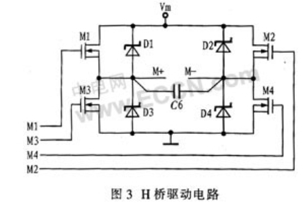 相對來說,利用2個N溝道功率MOSFET和2個P溝道功率MOSFET驅動電機的方案,控制電路簡單、成本低。但由于加工工藝的原因,P溝道功率MOSFET的性能要比N溝道功率MOSFET的差,且驅動電流小,多用于功率較小的驅動電路中。而N溝道功率MOSFET,一方面載流子的遷移率較高、頻率響應較好、跨導較大;另一方面能增大導通電流、減小導通電阻、降低成本,減小面積。綜合考慮系統(tǒng)功率、可靠性要求,以及N溝道功率MOSFET的優(yōu)點,本設計采用4個相同的N溝道功率MOSFET的H橋電路,具備較好的性能和較高的可靠性,并具有較大的驅動電流。其電路圖如圖3所示。圖中Vm為電機電源電壓,4個二極管為續(xù)流二極管,輸出端并聯(lián)一只小電容C6,用于降低感性元件電機產生的尖峰電壓。