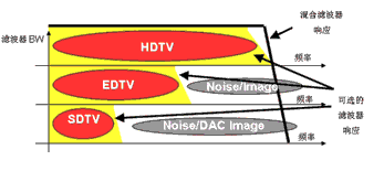 ED 480p/576p信號也可能出現這種情況。此類信號通常采樣頻率為54MHz,視頻帶寬為 12MHz。因此,第二Nyquist區(qū)圖像會在42MHz時出現。如果無源濾波器為35MHz或更高,那么圖像的衰減也會很小,同樣也會導致畫質非常差。