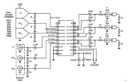 AC偏置非常簡單。THS73x3有兩個電阻,其可在電源和接地間創(chuàng)建分壓器。該模式的輸入阻抗為20kΩ,因此所用的電容應足夠大,以盡可能減小傾斜或下垂問題。該模式最適用于Chroma或色差信號,也可用于Luma信號、G’B’R’信號或計算機的R’G’B’信號。由于信號為AC耦合,且DC偏置點與平均信號電平有差異,因此對于帶5V電源同步信息的信號而言,我們最好用AC偏置模式,以確保沒有剪切問題發(fā)生。