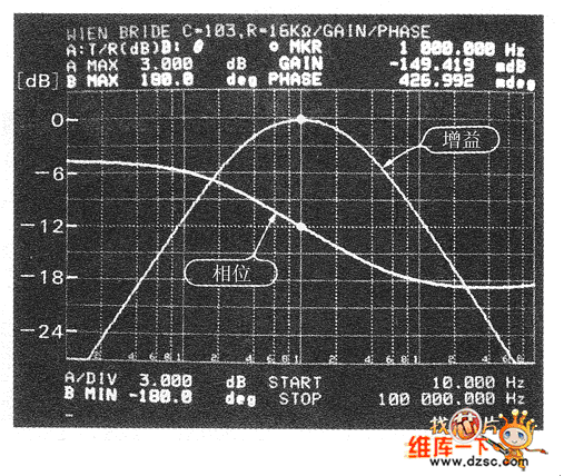 圖2 文式電橋電路增益相位特性