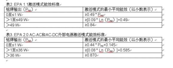 美國環(huán)保署外部電源1.1版和2.0版規(guī)范分別對激活模式能效標(biāo)準(zhǔn),以及AC-AC和AC-DC外部電源激活模式能效標(biāo)準(zhǔn)做出了規(guī)定,如表2和表3所示。
