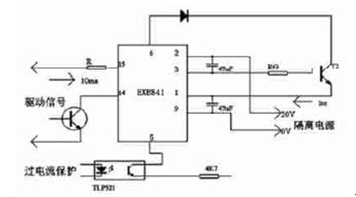 EXB84 系列為日本富士公司推出的IGBT專用芯片,能驅(qū)動(dòng)高達(dá)300A/1200V 的IGBT。它具有隔離強(qiáng)度高、反應(yīng)速度快、參數(shù)一致性好、具有防擎住效應(yīng)的緩關(guān)斷電路等優(yōu)點(diǎn),并可以對(duì)IGBT實(shí)施過流保護(hù)。模塊內(nèi)功能較全,用+20V 直流電源供電,能產(chǎn)生+15V 開柵電壓和-5V 關(guān)柵電壓,內(nèi)裝TLP550 高速光耦信號(hào)隔離電路。如圖1。電路的內(nèi)部還集成有過流檢測(cè)電路和慢速過流切斷電路,其過流檢測(cè)電路按驅(qū)動(dòng)與集電極電壓之間的關(guān)系檢測(cè)過流。當(dāng)流過IGBT的電流超過內(nèi)部設(shè)定值時(shí),慢速切換電路以不使IGBT 損壞的較慢速度關(guān)斷IGBT。其中,為了防止IGBT集電極產(chǎn)生大的電壓尖脈沖,在柵極串聯(lián)電阻RG、47 F 電解電容器吸收由于電流源接線電阻引起的供電電壓變化,而不是電源濾波器的電容器。