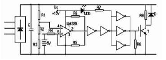 設(shè)UDC為電力電容C1 兩端的電壓,電壓比較電路直接檢測(cè)該電壓,與被測(cè)值超過設(shè)定允許值時(shí),電壓比較器反轉(zhuǎn), 觸發(fā)制動(dòng)單元VB 導(dǎo)通,電力電容上的電荷經(jīng)R 釋放,使電壓降低,反之,當(dāng)該電壓低于設(shè)定允許值時(shí),電壓比較器翻轉(zhuǎn)回原先狀態(tài),輸出端為高電壓,經(jīng)邏輯轉(zhuǎn)換后關(guān)斷UB 。由于比較器為OC 門輸出,該端電壓近乎電源電壓UC。