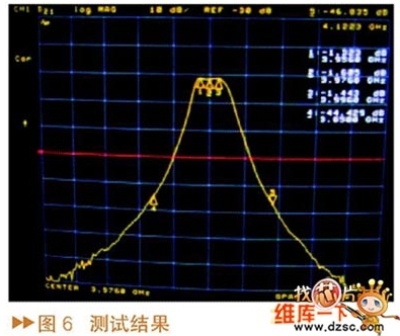 通過優(yōu)化得到濾波器的仿真結(jié)果如圖5所示,在仿真過程中為了提高仿真速度,全部的材料都設(shè)置成理想材料,所以仿真結(jié)果中濾波器插損為零。實際測試的濾波器的波形如圖6所示,可以看出,該方法設(shè)計的濾波器實際測試的結(jié)果與仿真的結(jié)果非常吻合,能夠達到指標要求。