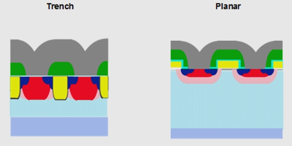 溝道型MOSFET的采用已成為當(dāng)前大部分車載應(yīng)用的標(biāo)準(zhǔn)。傳統(tǒng)的平面型MOSFET建立在硅晶圓表面之上,而溝道型MOSFET是在硅片上蝕刻垂直溝道,從而讓功率開關(guān)得以擁有更高的單元密度和更低的導(dǎo)通阻抗。由于這些電子機(jī)械系統(tǒng)大多數(shù)都采用了MOSFET H橋式電機(jī)驅(qū)動結(jié)構(gòu),兩個器件總是串聯(lián)以便使用更低電壓的MOSFET,同時仍然可以耐受常見的汽車高電壓沖擊現(xiàn)象。相比60V MOSFET,這些擊穿電壓更低的器件能夠把開關(guān)的導(dǎo)通阻抗降低50%,這意味著系統(tǒng)功耗減少50%,亦即系統(tǒng)發(fā)熱減少,最終把散熱要求降至最低。