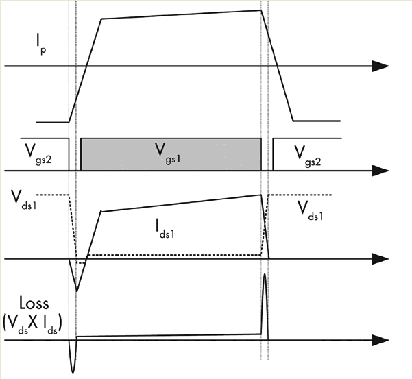 能量傳送網(wǎng)絡(luò)包含一個(gè)DC隔直電容和一個(gè)變壓器。這個(gè)網(wǎng)絡(luò)利用DC隔直電容 (CB) 消除方波電壓 (Vd) 的DC偏移,然后通過變壓器把純AC方波電壓傳送到次級(jí)端。由于存在泄漏電感,變壓器初級(jí)端電流Ip滯后于加在變壓器初級(jí)端上的電壓,這就讓MOSFET得以零電壓導(dǎo)通。如圖2所示,在其中一個(gè)開關(guān)斷開之后,Ip對(duì)MOSFET輸出電容進(jìn)行充電 (或放電),最終開關(guān)電壓從一個(gè)輸入電軌變化到另一個(gè) (從Vin到地或從地到Vin)。接著,Ip繼續(xù)流經(jīng)反向并聯(lián)的體二極管。只要體二極管導(dǎo)通,相應(yīng)的MOSFET就能夠零電壓導(dǎo)通。這種軟開關(guān)方案不僅可降低開關(guān)損耗,還能減小電磁干擾 (EMI)。