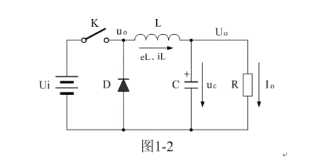 圖1-2是在圖1-1-a電路的基礎(chǔ)上,增加了一個整流二極管和一個LC濾波電路。其中L是儲能濾波電感,它的作用是在控制開關(guān)K接通期間Ton限制大電流通過,防止輸入電壓Ui直接加到負(fù)載R上,對負(fù)載R進(jìn)行電壓沖擊,同時對流過電感的電流iL轉(zhuǎn)化成磁能進(jìn)行能量存儲,然后在控制開關(guān)K關(guān)斷期間Toff把磁能轉(zhuǎn)化成電流iL繼續(xù)向負(fù)載R提供能量輸出;C是儲能濾波電容,它的作用是在控制開關(guān)K接通期間Ton把流過儲能電感L的部分電流轉(zhuǎn)化成電荷進(jìn)行存儲,然后在控制開關(guān)K關(guān)斷期間Toff把電荷轉(zhuǎn)化成電流繼續(xù)向負(fù)載R提供能量輸出;D是整流二極管,主要功能是續(xù)流作用,故稱它為續(xù)流二極管,其作用是在控制開關(guān)關(guān)斷期間Toff,給儲能濾波電感L釋放能量提供電流通路。