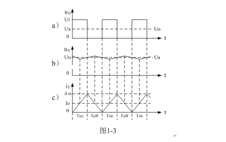 在此順便說明:由于電容兩端的電壓變化量ΔU相對于輸出電壓Uo來說非常小,為了簡單,我們這里把Uo當(dāng)成常量來處理。在某種情況下,如需要對電容的初次充、放電過程進(jìn)行分析時,必須需要建立微分方程,并求解。因為輸出電壓Uo的建立需要一定的時間,精確計算得出的結(jié)果中一般都含有指數(shù)函數(shù)項,當(dāng)令時間變量等于無窮大時,即電路進(jìn)入穩(wěn)態(tài)時,再對相關(guān)參量取平均值,其結(jié)果就基本與(1-4)相等。