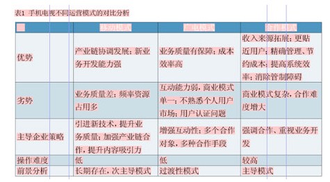 在手機(jī)電視運營模式上,應(yīng)以合作模式為主導(dǎo)模式,以移動模式為次主導(dǎo)模式,不同運營模式的對比分析見表1。
