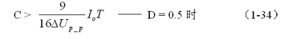 同理,(1-33)和(1-34)式的計算結果,只給出了計算反轉式串聯(lián)開關電源儲能濾波電容C的中間值,或平均值,對于極端情況可以在平均值的計算結果上再乘以一個大于1的系數(shù)。