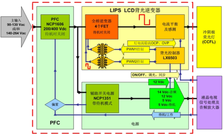 圖2:安森美半導(dǎo)體針對(duì)32英寸液晶電視的全橋高壓LIPS解決方案功能框圖。