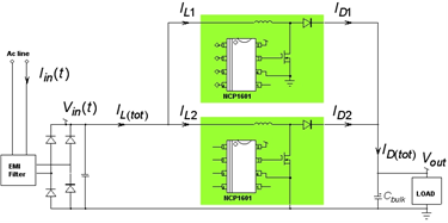 而在PFC方面,采用安森美半導(dǎo)體的NCP1606和NCP1654等PFC控制器,已經(jīng)可以將液晶電視厚度降到較低;為了支持低至10 mm的極纖薄設(shè)計(jì),可以采用兩顆相對(duì)較小的NCP1601芯片,用交錯(cuò)式架構(gòu)來來實(shí)現(xiàn),如圖3所示。交錯(cuò)式PFC是在原來放置單個(gè)較大PFC的地方并行放置兩個(gè)功率為一半的較小PFC。這兩個(gè)較小PFC以180°的相移交替工作,在輸入端或輸出端累加時(shí),它們可以抵消每相電流紋波的主要部分。