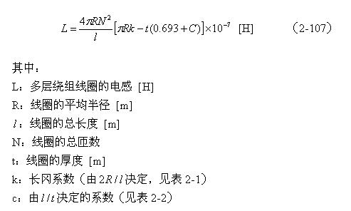 【說明】上式是用來計算多層線圈繞組、截面為圓形的空心線圈的電感計算公式。長岡系數(shù)k可查閱表2-1,系數(shù)c可查閱表2-2。當(dāng)線圈內(nèi)部有磁芯時,有磁芯線圈的電感是空心線圈電感的
