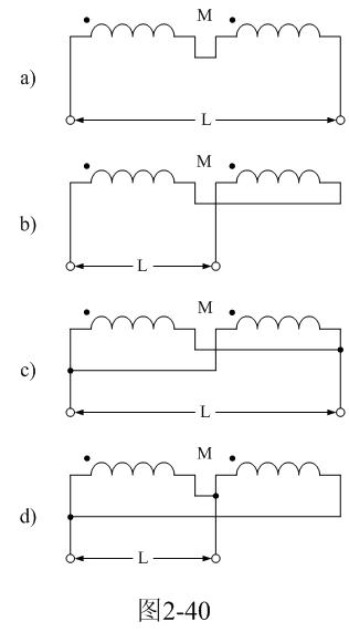 【說明】互感M有正負(fù),圖2-40-a和圖2-40-c的接法互感M為正,圖2-40-b和圖2-40-d的接法互感M為負(fù)。兩個線圈之間的互感M為:
