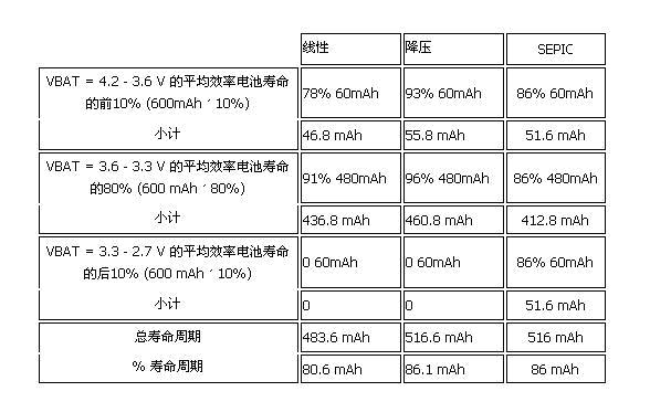 從表面上來看,設(shè)計人員若能繼續(xù)使用電池直到2.7V,并利用正電源降壓—升壓轉(zhuǎn)換器或是SEPIC轉(zhuǎn)換器提供3.3V電源,可攜式裝置的電池壽命就會大幅延長,但是根據(jù)(表一)針對600mAh電池所做的簡單分析可發(fā)現(xiàn)情形并非如此,因為無論是采用效率更高的降壓轉(zhuǎn)換器,并將電池使用到3.3V,或是采用SEPIC之類的轉(zhuǎn)換器,并將電池電力完全用盡,這兩種方式的供電時間幾乎沒有任何區(qū)別。