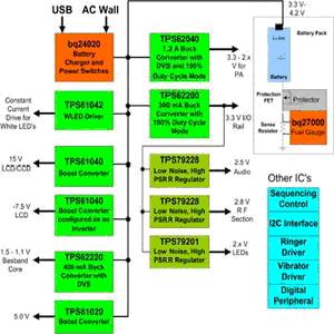 在這個解決方案中,就算鋰離子電池下降至3.3V左右,在100%負載周期模式下工作的高效率TPS62200降壓轉(zhuǎn)換器仍能提供3.3V的I/O電壓。上述所有零件都采用SOT-23封裝,除了bq24020電池充電組件、TPS61020升壓轉(zhuǎn)換器以及TPS61042白光二極管驅(qū)動組件之外,它們是采用3×3平方厘米的QFN封裝。TPS61040和TPS61042還內(nèi)建上端FET晶體管,每顆組件只需要一個外接二極管。bq24020、TPS622xx、TPS61020和線性穩(wěn)壓器組件全都內(nèi)建FET晶體管,功率放大器和中央處理器電源采用的動態(tài)電壓調(diào)整技術(shù)可以提高每顆零件的效率,進而協(xié)助降低功耗。
