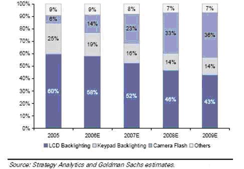 可拍照手機(jī)有取代傳統(tǒng)中低端數(shù)碼相機(jī)的趨勢(shì),并且消費(fèi)者期望能夠在低光照亮度的條件下拍攝高質(zhì)量的照片,因而采用Flash LED作為閃光燈是提高數(shù)碼相機(jī)性能的重要措施。Flash LED的光學(xué)特性決定它既可以作為拍照的閃光應(yīng)用,也可以用于視頻拍攝時(shí)補(bǔ)光,甚至是用于照明的電筒應(yīng)用。因此Flash LED在手機(jī)中的應(yīng)用將會(huì)越來(lái)越普遍,表1為Flash LED作為閃光燈在手機(jī)LED應(yīng)用中的比例走勢(shì)。