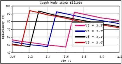 圖4、5分別是SP6686在150mA電筒模式和400mA閃光模式時(shí)的效率曲線: