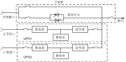 目前,為了提高UPS的可靠性,主要采用主從結(jié)構(gòu)的UPS“1+1”并聯(lián)備份,如圖4所示。雖然這樣在一定程度上提高了供電可靠性,但是不便于離線維護(hù)、擴(kuò)容,同時也造成設(shè)備利用不充分、缺乏靈活性等方面的缺陷。對于一些不能夠停電的用戶(例如醫(yī)療、銀行、金融、通信、國防等行業(yè)),UPS“1+1”并聯(lián)備份,還是存在很大的電力系統(tǒng)癱瘓隱患。