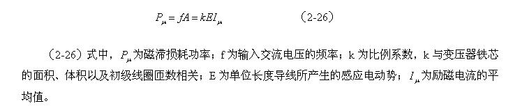 (2-25)式中,A為一個周期內(nèi)變壓器鐵芯的磁滯損耗,單位是焦耳;E為單位長度導線所產(chǎn)生的感應電動勢,單位為伏; 為勵磁電流的平均值,單位為安培;T為輸入交流電壓的周期,單位為秒,f為脈沖頻率,或開關電源的工作頻率,單位為赫芝;k為比例系數(shù),它是一個與選用單位制和變壓器鐵芯面積、體積以及初級線圈匝數(shù)等參數(shù)相關的常量。在(2-21)、(2-22)、(2-23)、(2-24)式中,沒有比例系數(shù)k,是為了使問題簡單,便于分析。