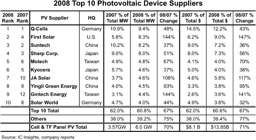 08年全球太陽能電池廠商市場份額排名 尚德第三名