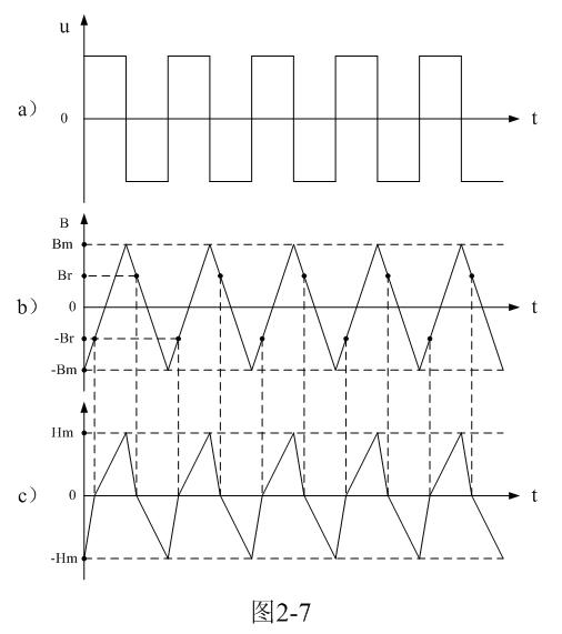 在正常情況下,當有交流脈沖電壓輸入時,磁通密度B就會沿著理想磁化曲線d-a,由負最大值-Bm至正最大值Bm,然后,又由正最大值Bm至負最大值-Bm,來回地變化;對應磁場強度H也是沿著理想磁化曲線d-a由負最大值-Hm至正最大值Hm,然后,又由正最大值Hm至負最大值-Hm,來回變化。