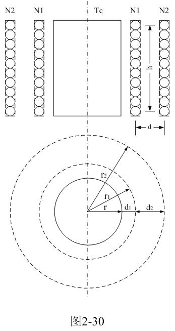 在圖2-30中,N1、N2分別為變壓器的初、次級(jí)線圈,Tc是變壓器鐵芯。r是變壓器鐵芯的半徑,r1、r2分別是變壓器初、次級(jí)線圈的半徑;d1為初級(jí)線圈到鐵芯的距離,d2為初、次級(jí)線圈之間的距離。為了分析計(jì)算簡單,這里假設(shè)變壓器初、次級(jí)線圈的匝數(shù)以及線徑相等,流過線圈的電流全部集中在線徑的中心;因此,它們之間的距離全部是兩線圈之間的中心距離,如虛線所示。