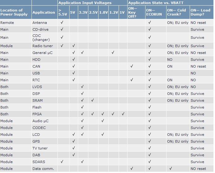 大多數系統(tǒng)電源的基本架構選擇應從電源要求以及汽車廠商定義的電池電壓瞬變波形入手。對于電流的要求應該反映到電路板的散熱設計。表1歸納了大多數設計的電路及電壓要求。