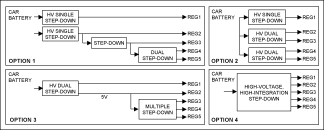 以下列出了四種常用的電源架構,總結了最近三年汽車領域的典型設計架構。當然,用戶可以通過不同方式實現(xiàn)具體的設計要求,多數方案可歸納為這四種結構中的一種。
