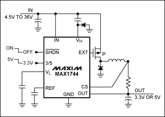圖6.MAX1744/MAX1745為高壓(36V)、降壓型DC-DC控制器。
