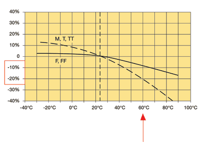 與大多數(shù)電子元件一樣,熔絲也會隨溫度的變化而降低額定值。例如,原本在室溫下只需使用1A大小延時熔絲的電路,在60℃下必須使用1.25A大小的熔絲,以保證電路能夠在較高溫度下正常工作(如圖1所示)。