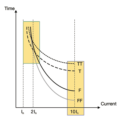 圖1圖中的下降曲線是中等延時型(T)和快速響應(yīng)型(F)熔絲的普通曲線