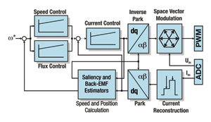 電動(dòng)機(jī)的電流波形是正弦曲線,這可以產(chǎn)生平穩(wěn)的扭矩,而且會(huì)減小機(jī)械震動(dòng)和噪聲。外部速度回路調(diào)整供電的定子數(shù)量,這直接與定子電流的積分成比例,并維持所要求的角速度。為了在基本速度之上擴(kuò)展工作速度的范圍,增加了額外的磁通弱化回路,用于處理定子定向磁通電流。