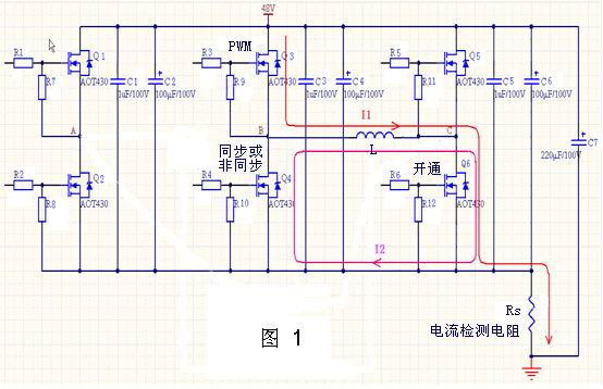 由于無刷電機(jī)具有高扭矩、長壽命、低噪聲等優(yōu)點(diǎn),已在各領(lǐng)域中得到了廣泛應(yīng)用,其工作原理也已被大家廣為熟知,這里不再詳述。國內(nèi)電動(dòng)車電機(jī)控制器通常工作方式為三相六步,功率級原理圖如圖1所示,其中Q1, Q2為A相上管及下管;Q3, Q4為B相上管及下管;Q5, Q6為C相上管及下管。MOSFET全部使用AOT430。 MOSFET工作在兩兩導(dǎo)通方式,導(dǎo)通順序?yàn)镼1Q4→Q1Q6→Q3Q6→Q3Q2→Q5Q2→Q5Q4→Q1Q4,控制器的輸出通過調(diào)整上橋PWM脈寬實(shí)現(xiàn),PWM頻率一般設(shè)置為18KHz以上。