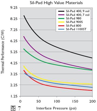 圖7為SilPad系列導(dǎo)熱材料對TO-220封裝的導(dǎo)熱性能隨壓力變化的曲線。