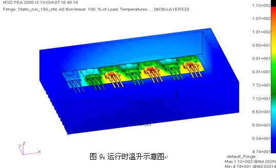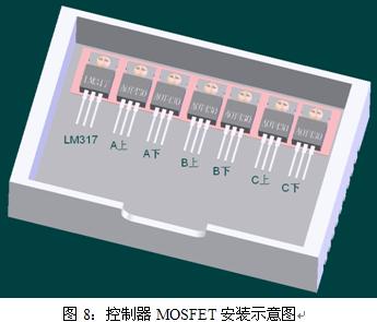 仿真條件:Ptotal=56.85W、Ta=45℃、控制器散熱器尺寸:70mm×110mm×30mm 、自然風(fēng)冷,MOSFET安裝如圖8所示。